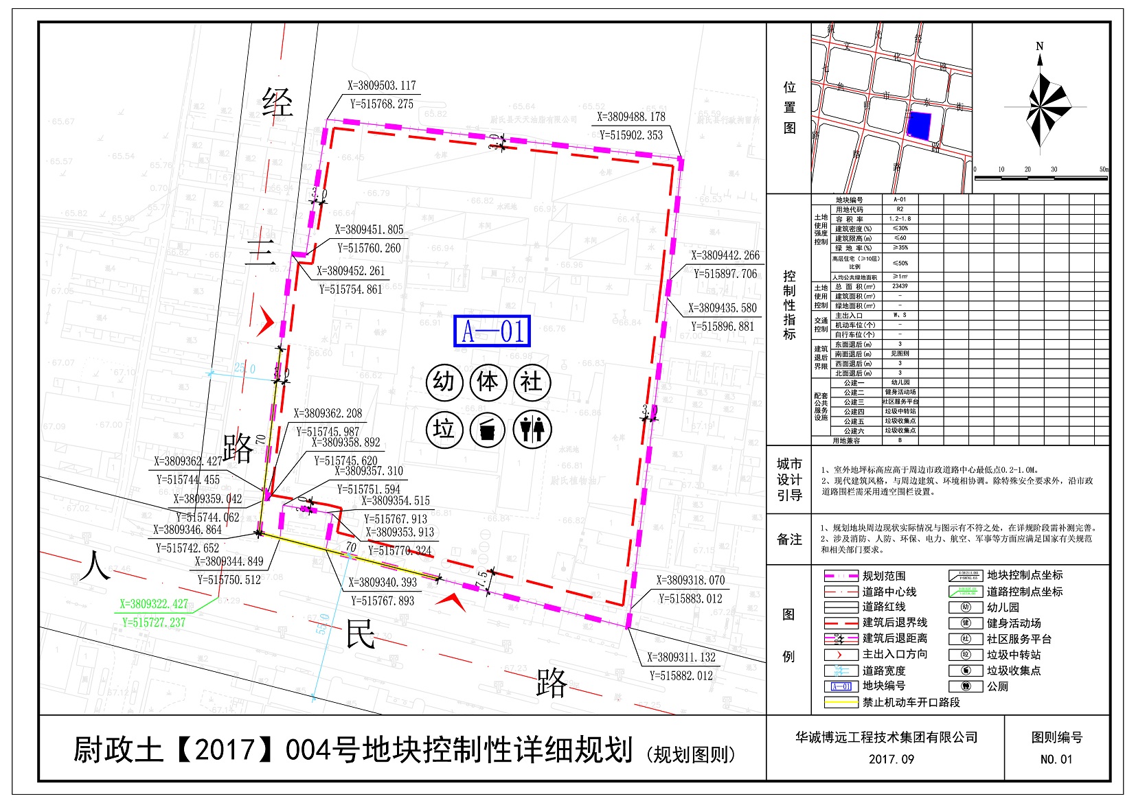 尉政土【2017】004号地块位于尉氏县城人民路与规划经三路交叉口东北角,用地性质为二类居住用地。详见附图“尉政土【2017】004号地块控制性详细规划(规划图则)”。