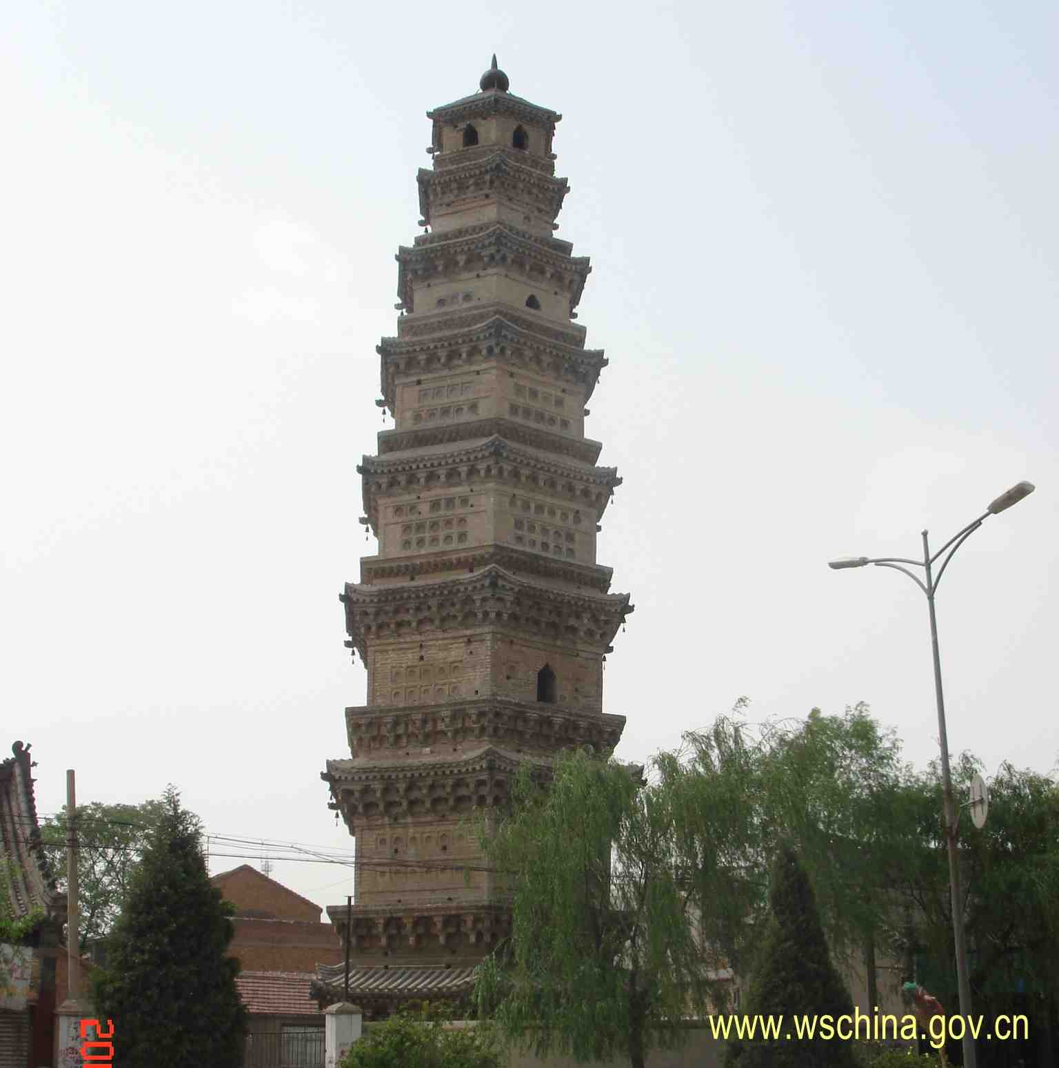 代累遭兵燹寺废而塔存。塔体为八层六棱重檐楼阁式砖塔,塔阶作盘旋式,现地表以上通高三十米,直径七米零六,塔内外均嵌有佛龛和图案、假门、假窗等造型,腰檐互饰斗拱均仿木结构,外观庄严淳厚,为我县重要古建筑。明嘉靖二十五年(公元1546年)重修上三层,(塔顶刻有碑记)。一九三八年日寇犯尉,第二层西北角和第三层东北、西北角遭炮击破坏;蒋介石扒开花园口,黄水侵蚀,下层被淤一米多,塔门坍塌。解放后党和政府为了加强文物保护管理,一九五六年省人民委员会公布列为省文物保护单位之一,一九六四年和一九八二年两次拨款由县文化馆组织民工进行了维修加固。